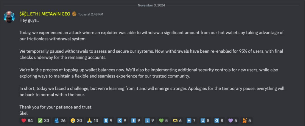 Online casino @metawincom lost around $4 million in a hack on November 3, targeting its hot wallets through a flaw in its withdrawal system, according to CEO Skel.