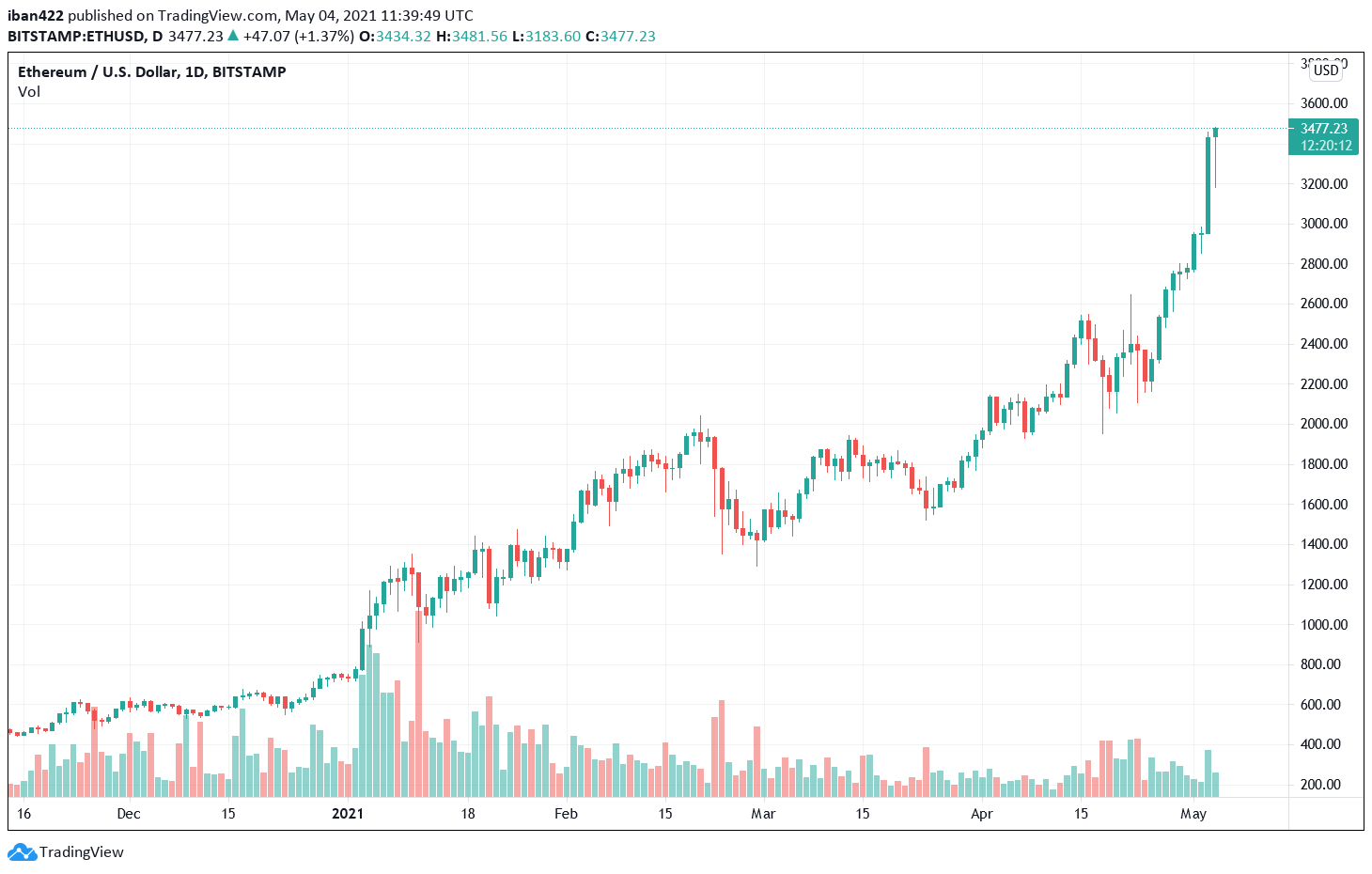 This comes at a time when Ethereum is gaining. On Monday, ETH added over 16% pushing the coin to a new record of slightly over $3,450.