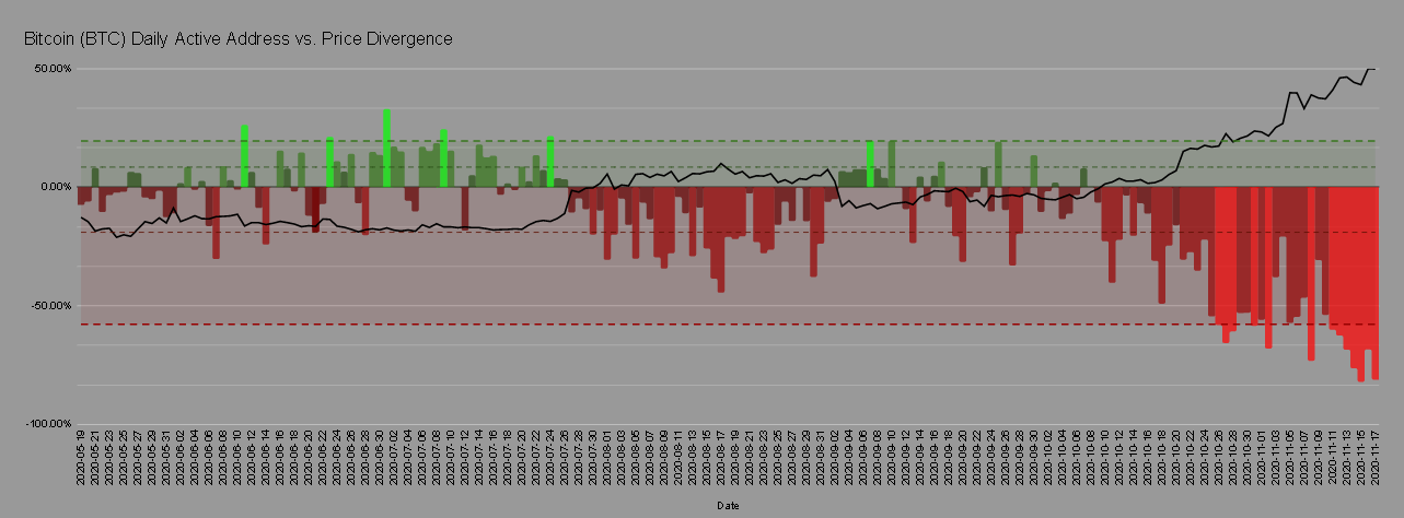 The graph above shows that DAA vs. Price Divergence remains in the bearish territory since October 2020. But ignoring that, the Bitcoin price is marching towards $20,000, its current record high. That is further increasing the divergence and strengthening the market’s bearish bias.