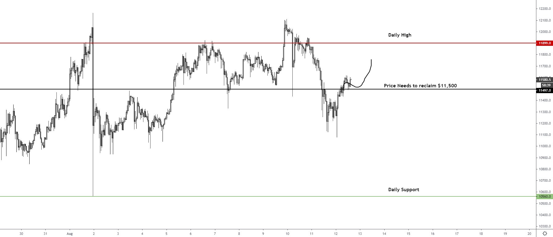 “Reclaim $11,900 on a daily close and we go up to $12,500 [and above], ” Mr. Rager stated. “Not worried one bit in this range unless price breaks below $10,500.”