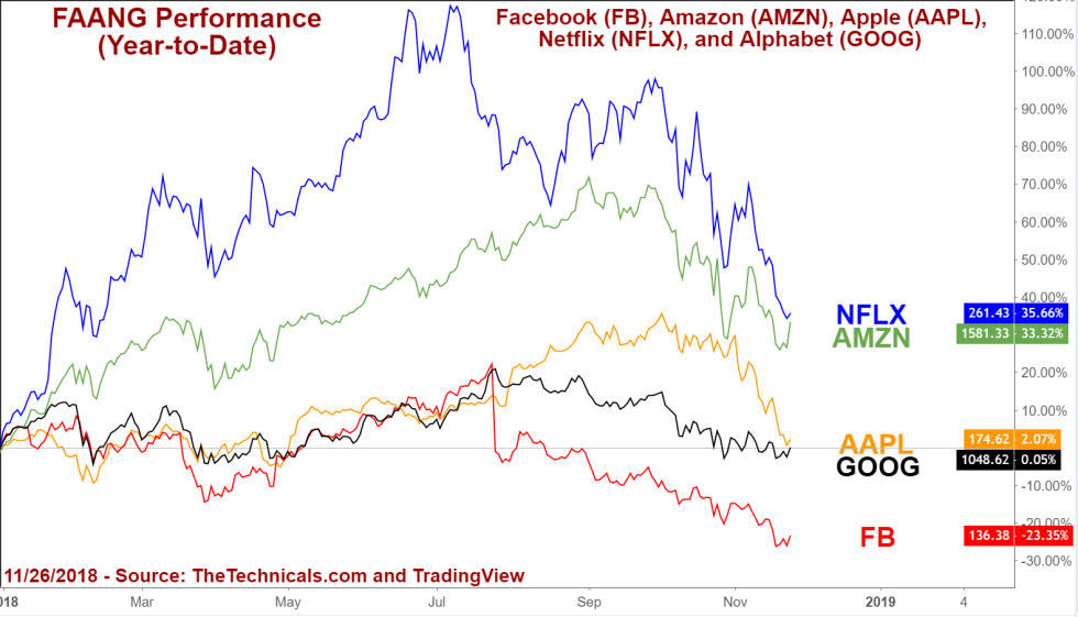 Among the FAANGS, Netflix (NFLX) was the worst performer, down -34.8% for the year (as of December 13th), followed closely by Facebook at -33.7%, according to data from Investopedia.