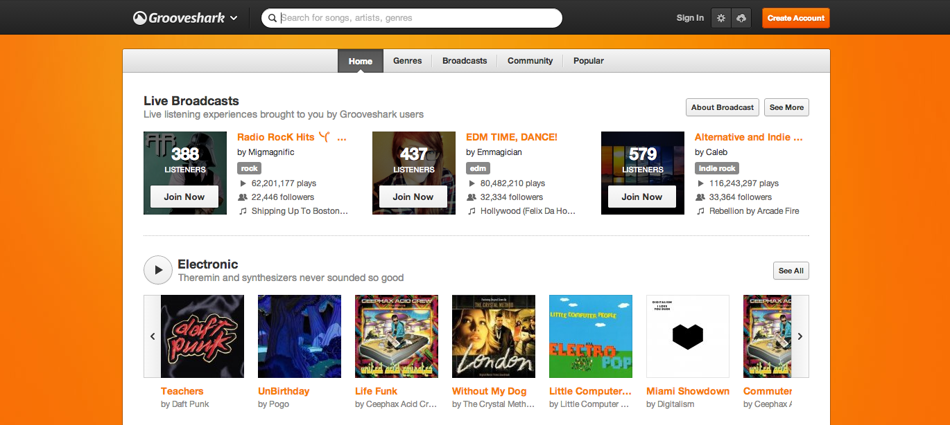 Grooveshark has a search engine, streaming services and recommendation application. Users can stream and upload music that can be played immediately or added to a playlist. Grooveshark’s catalog streams over 1 billion sound files per month, contains over 15 million songs and has 20 million users.