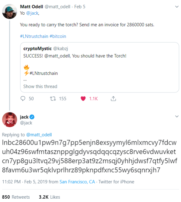 The fun was started on January 19th by @hodlonaut. So far the torch has changed hands 153 times and the pot is up to 0.0286 BTC ($94.61). Last night, the game was kicked up to the next level when the torch was passed to the founder and CEO of Twitter and the CEO of Square, Jack Dorsey.