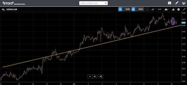 The US Dollar pulled back slightly and is now testing its upward trend line.