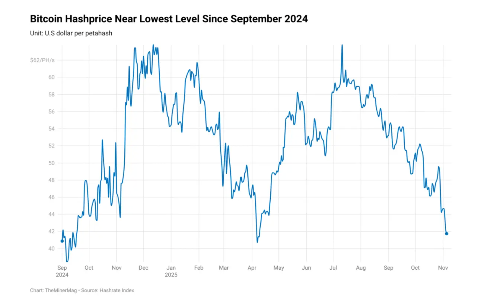 According to industry reports, hash price — the expected daily revenue per unit of computing power — is about $42 per PH/s today, down from above $62 per PH/s in July.