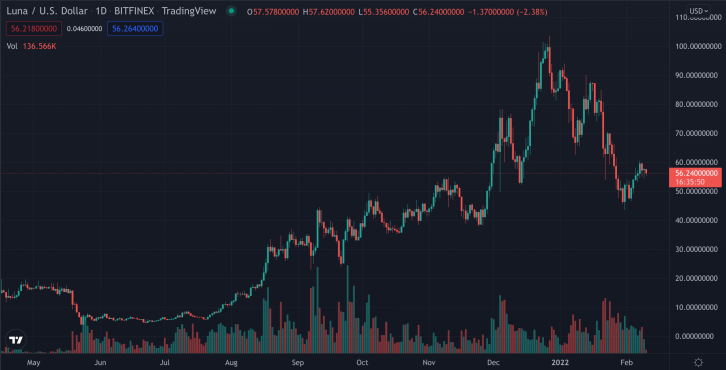 Terra Luna's native LUNA token had an exceptional 2021, and looks to continue scaling acceptance and adoption. | Source: LUNA-USD on TradingView.com