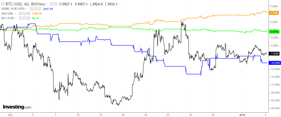 Here we can see bitcoin in black, the S&P500 stock index in blue, the USD in green, and Gold in orange.