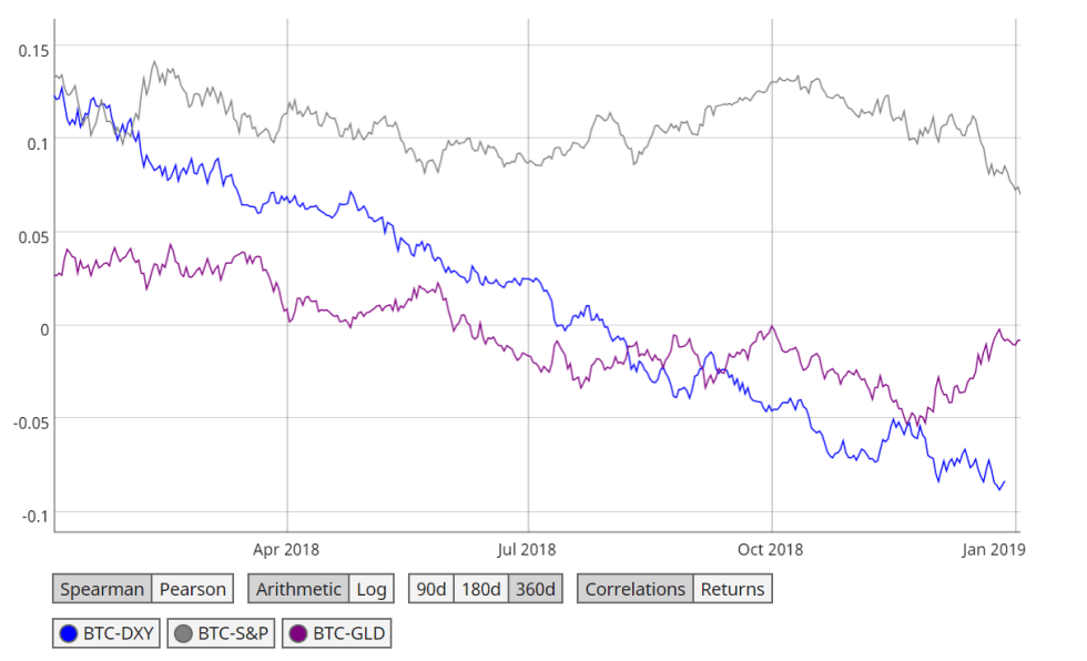 This shows bitcoin’s correlation to the USD (Blue), the US stock market (grey), and gold (purple).