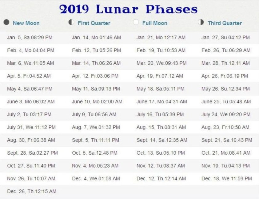To this point, I’d like to present this year’s lunar schedule. We should probably check in throughout the year to see if there’s any effect. Notice, the first significant date is a new moon, which occurs tomorrow evening.