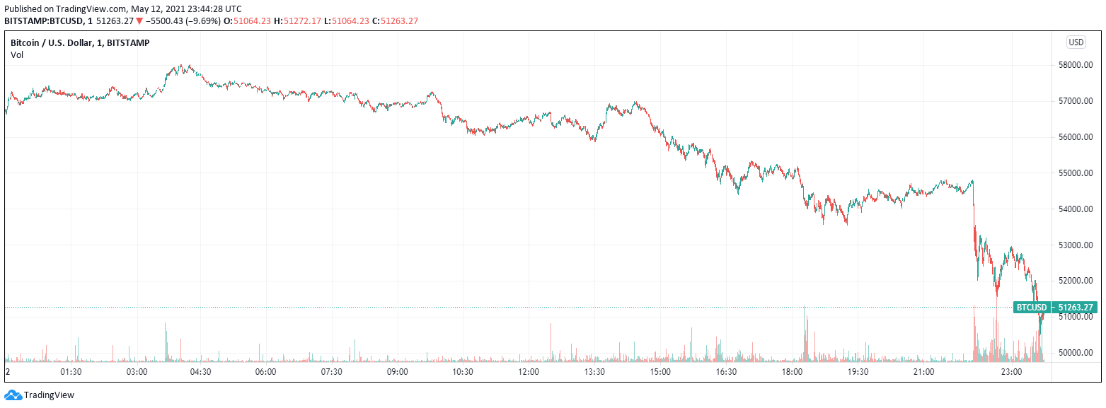 Following Musk’s announcement, Bitcoin prices immediately plummeted 10%, dropping down to $51,000.