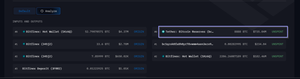 In a snapshot offered by Arkham on its official website, it revealed that the stablecoin company withdrew 8,888 Bitcoins from Bitfinex, a leading exchange and Tether’s sister company, on Monday.