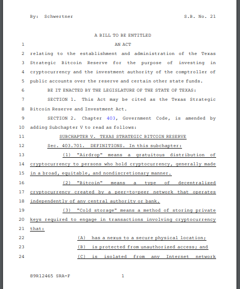 The SB-21 aims to establishes a Bitcoin reserve in Texas. Source: Texas State Senate