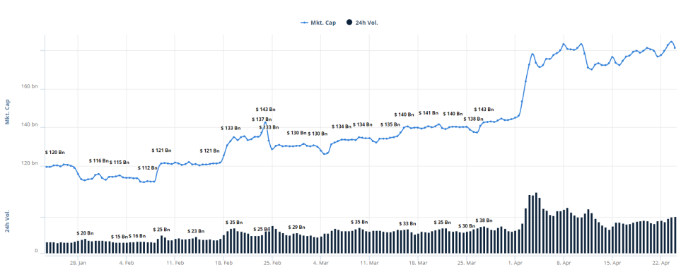 Here’s a graph of the overall market cap and reported (allegedly fake) volumes across global crypto exchanges during that time.