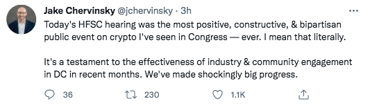 Although general concerns were expressed, there was also support for crypto’s technological potential. Rep. Pete Sessions (R-Texas) said: “I’m in favor of what you do. I’m not sure I want to go as far as you do on [the] robustness of how much oversight you really want.”