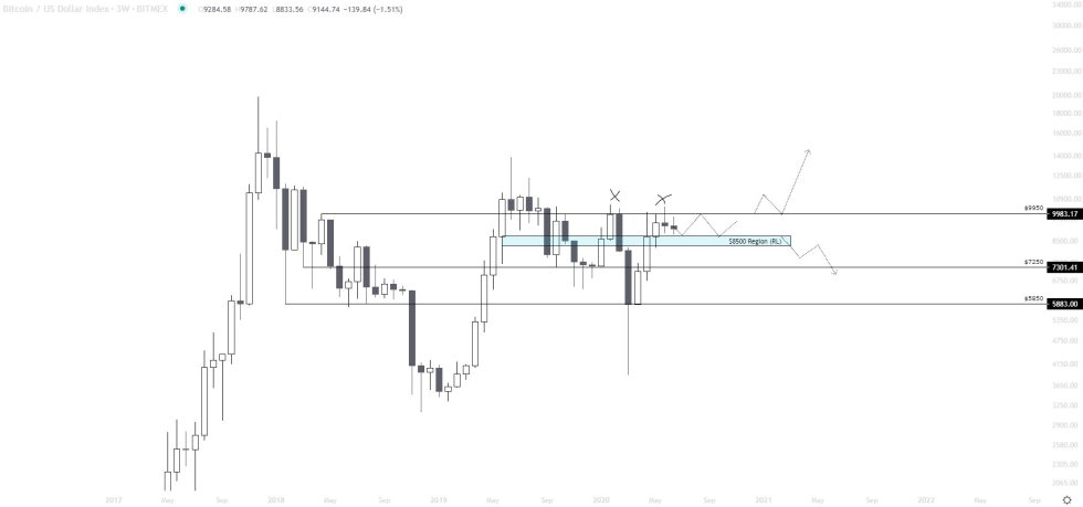 “BTC HTF Update: Rejected $10,000 for the second time this year and it seems as though HTF momentum is starting to slow, expecting price just to range here for a while, which is fine as long as buyers continue to support RL… Thinking a retest of RL at $8600 region is likely,” he said.