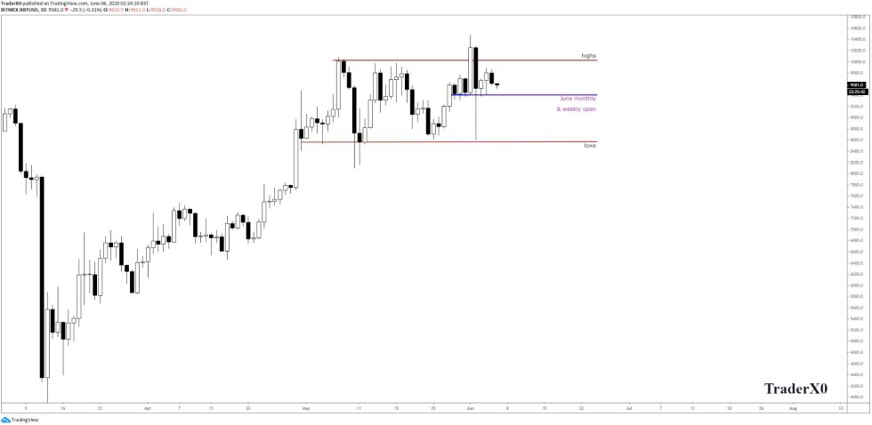 This is around the level at which the cryptocurrency has been trading at throughout the past several days, forming a relatively tight trading range between $9,400 and $9,800.