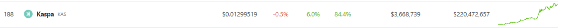 At the time of writing, KAS was trading at $0.0131, up an impressive 84.5% and emerging as the only crypto with such massive rally in the top 200 coins listed by Coingecko.