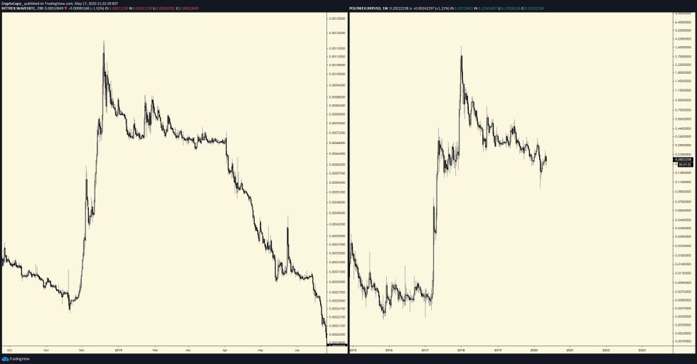 One recently emerged fractal pattern that investors have been pointing to shows that XRP’s recent price action is strikingly similar to that seen in early-2019, just before it posted an over 50% decline against its BTC trading pair.