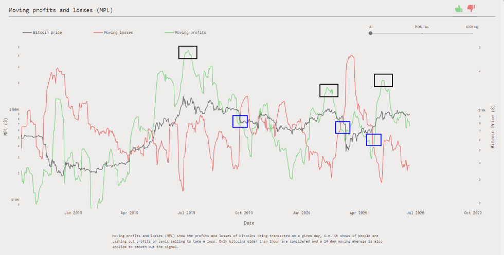 The same trader who spoke about the vital nature of Bitcoin’s $9,000 support also explained that one concerning trend is that most traders are currently profitable, with moving profits not yet crossing moving losses.