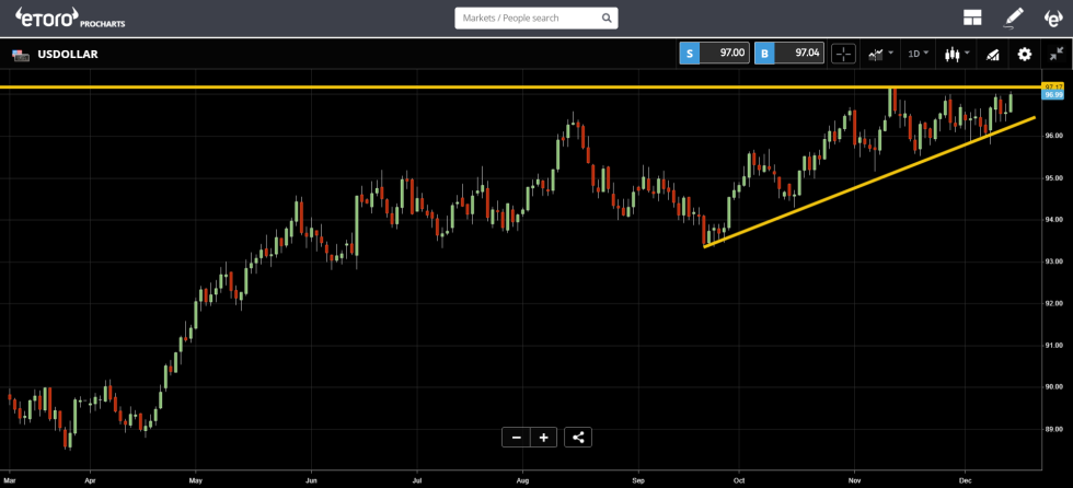 Here’s the graph we’ve been tracking that shows a rather clear ascending triangle for the US Dollar index. Definitely looks like a breakout pattern.