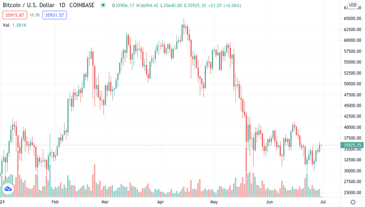 Despite bitcoin's pullback, Brady looks to his latest partnership to help right the ship after his Twitter "laser eyes" preluded a dip. | Source: BTC-USD on TradingView.com