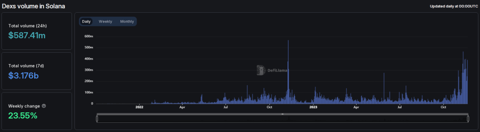 The limelight on the crypto extends beyond its price surge, as DefiLlama reports a noteworthy surge in the trading volume across Solana’s decentralized exchanges (DEXs).