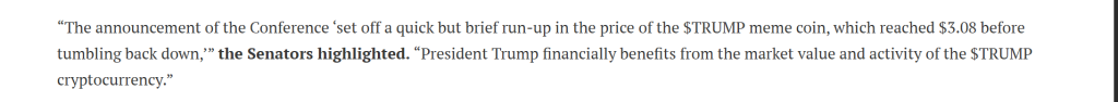 The senators put it plainly. They wrote that organizers were promoting the conference by holding out the prospect of a presidential appearance to potential attendees — and that doing so was encouraging people to buy the coin.