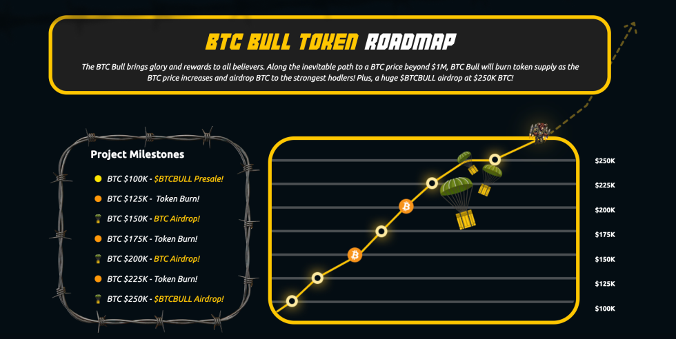 В основата на екосистемата стоят еърдропи: когато Биткойн достигне определени нива като $150K и $200K, притежателите на $BTCBULL получават безплатно реален $BTC. Ако Биткойн достигне $250K, допълнителни $BTCBULL токени ще се появят в портфейла ви — без да правите нищо.