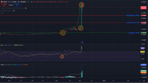 Current market data suggests that Tron’s price may face some challenges soon. The Relative Strength Index (RSI) is now at 84.2. This shows that TRX is overbought, which could mean a price drop in the short term. However, the MACD (0.0382) remains positive, showing strong buying momentum.
