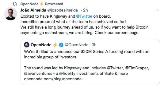 The bitcoin payment processor OpenNode just announced the close of a $20 million Series A funding round led by Twitter, UK-based Kingsway, venture investor Tim Draper, and Avon Ventures. The company now valued at $220 million focuses on building Bitcoin and Lightning Network payments infrastructure.