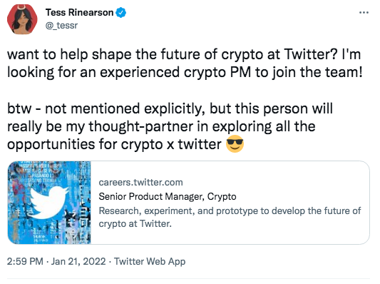 The company has moved forward to affiliate with cryptocurrencies integrating NFTs, growing its crypto team, and moving further into Web3. CFO of Twitter Ned Segal has also talked about implementing Bitcoin as a tool to “facilitate commerce” in the platform.