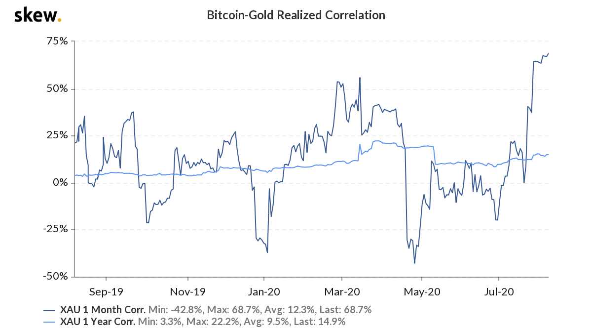 The cryptocurrency’s one-month realized correlation withe the precious metal hit 68.7 percent on August 6, its highest this year. Given the relationship continues further into the year, Bitcoin may end up hitting $14,000 as gold hits $2,500.