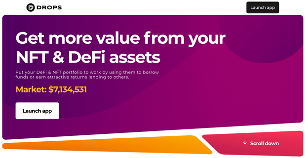 Drops is an NFT marketplace that basically operates like a sandbox with various trading, loan, staking, and other asset management options. The platform primarily gives access to loans for both DeFi and NFT assets. The Drops allows its users to open a permissionless lending pool.