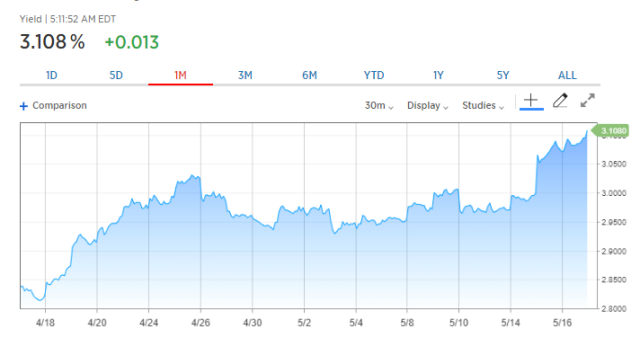 As you can see, the rally is having a difficult time climbing higher in the face of higher borrowing costs. Of course, the bond moves in the US are rather small compared to what’s happening in Italy right now.