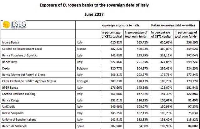 Within Italy itself, the situation is potentially explosive. Here we can see overall exposure that various banks have to Italian bonds. Notice the overwhelming presence of triple digit numbers here?