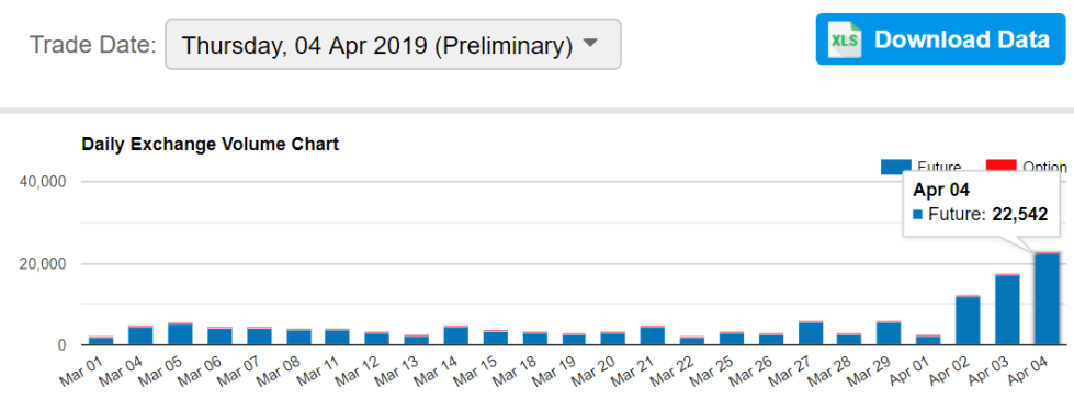 Here we can see the volumes on CME’s bitcoin futures product, which reached 22,542 contracts yesterday, which is about $563 million.