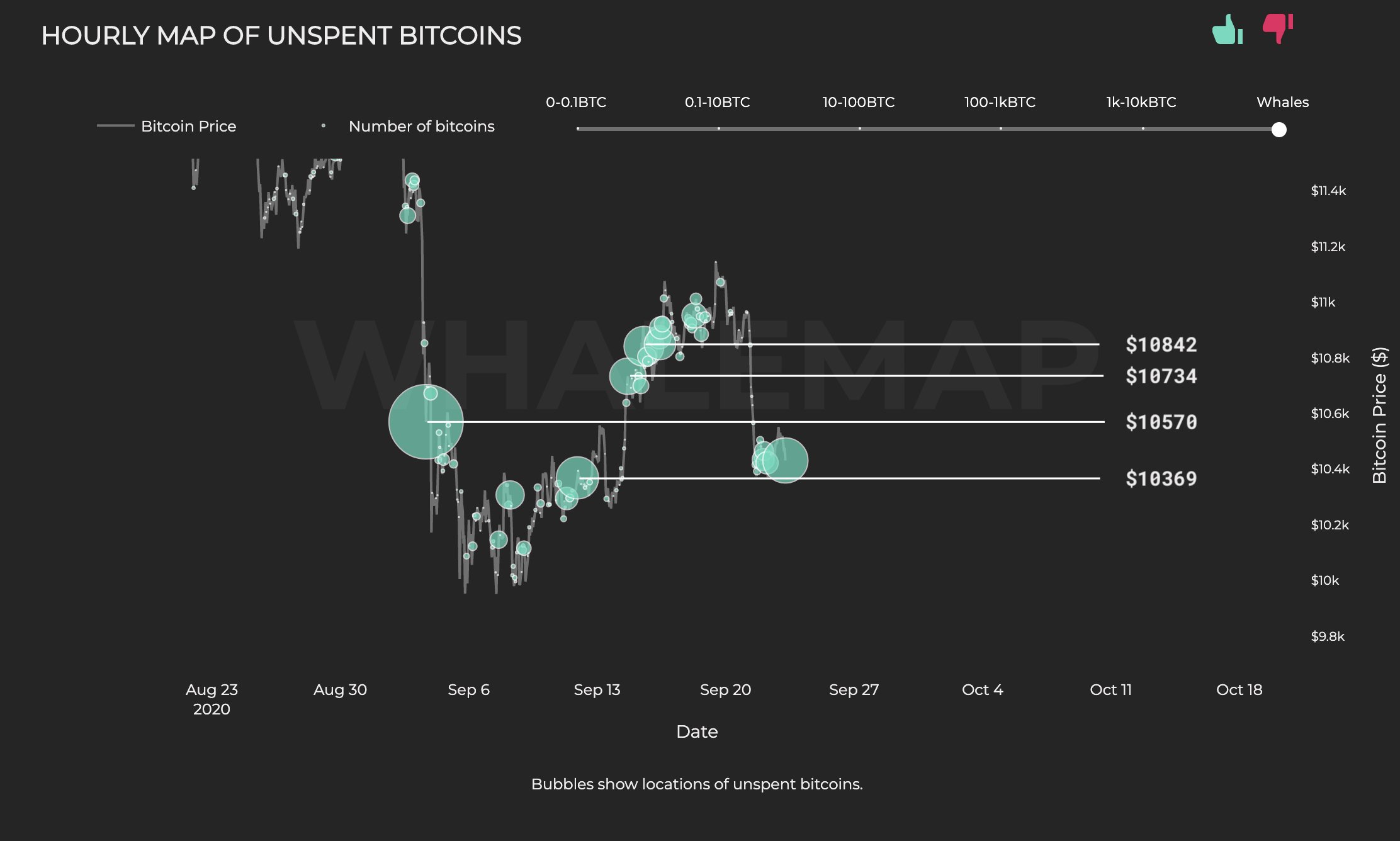 “Bubbles show locations where unspent bitcoins were accumulated. The larger the bubble, the more unspent bitcoins are located there. P.s. Unspent means these bitcoins have not been moved since they were ‘inflowed’ to a whale wallet.”