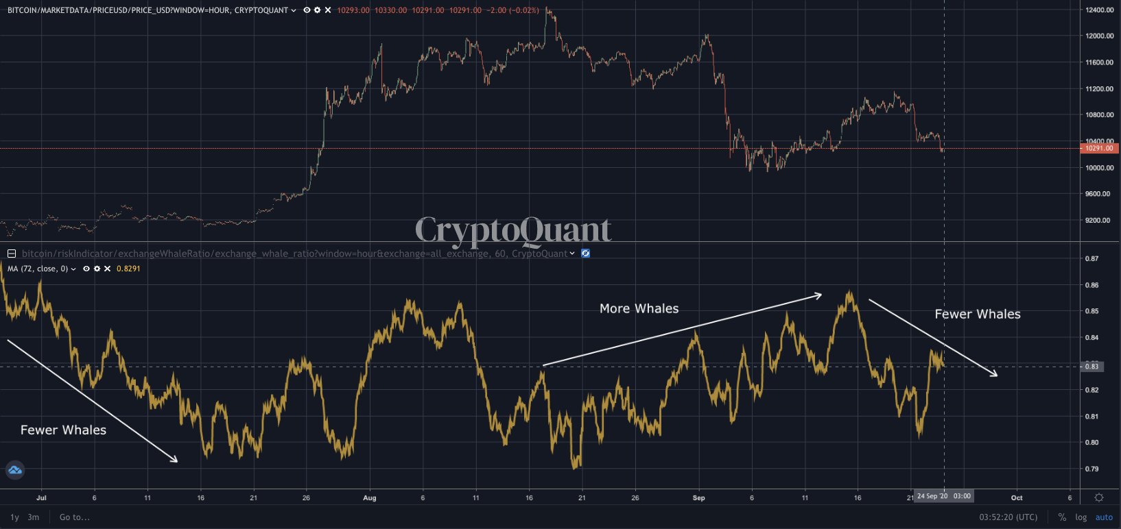Mr. Ju predicted the said correlation before the Bitcoin’s drop below $10,300 this Wednesday. On September 21, he envisioned a short-term price correction for the cryptocurrency based on a jump in whale activity. The BTC/USD corrected later, crashing by as much as 7.81 percent from its local top near $10,990.