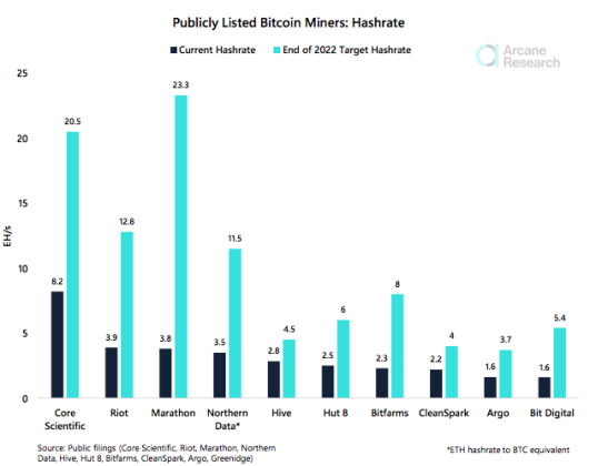Marathon’s hashrate level is in third place at the moment compared to Core Scientific’s and Riot’s, but the company plans to lead in 2022 with the fastest expansion amongst all public miners.