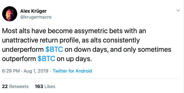 Earlier this week, economist and crypto analyst Alex Krüger tweeted that in his opinion, the majority of altcoins have “become asymmetric bets with an unattractive return profile.”