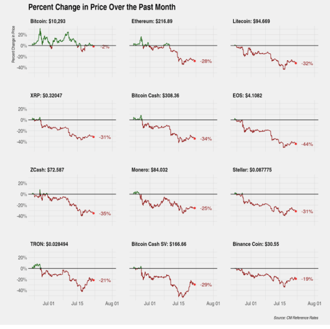 Data from the report shows that over the month of July the majority of altcoins were down more than 40%. This came as Bitcoin had only dropped 2% at the time of the report’s publication.