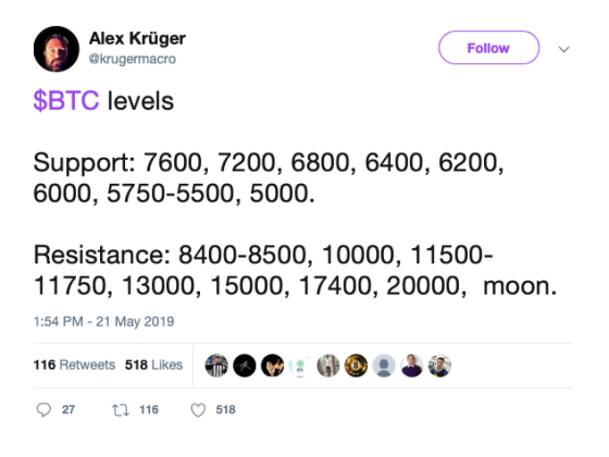 Recently Alex Kruger also shared his analysis of key support and resistance levels for BTC/USD [coin_price] and similar to other forecasts, bitcoin has few immediate resistance points above $10,000.