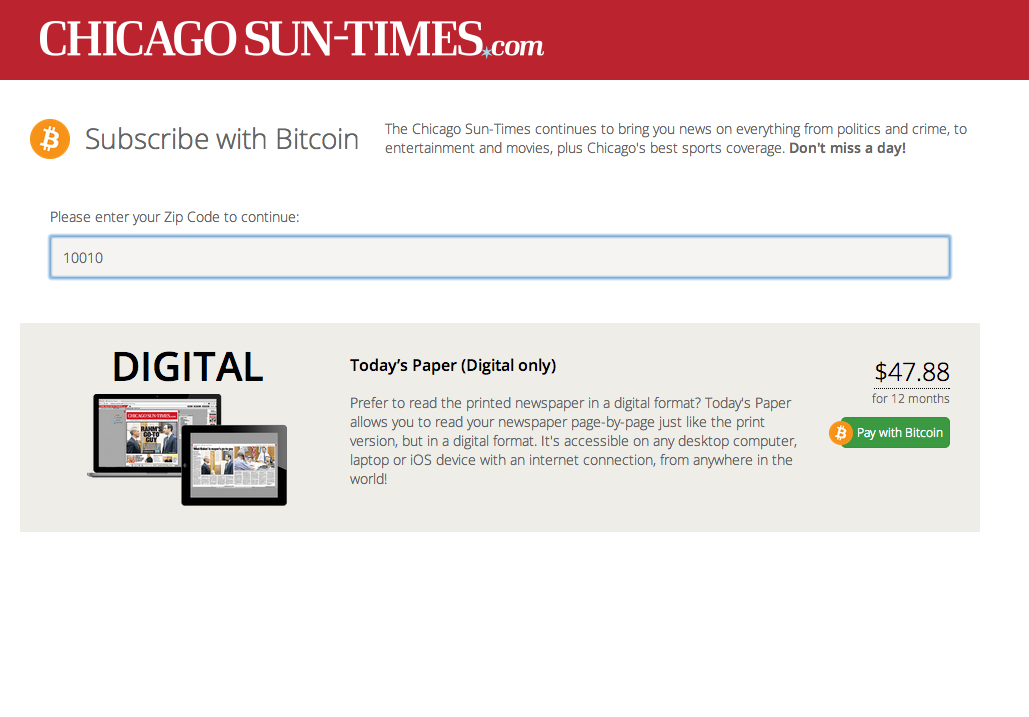 The paper plans to run ads with printed QR codes, allowing readers to use bitcoin to buy products directly. The first test of this is planned in conjunction with a local ticket exchange for tickets to a Jay-Z/Beyonce show at Soldier Field this summer.