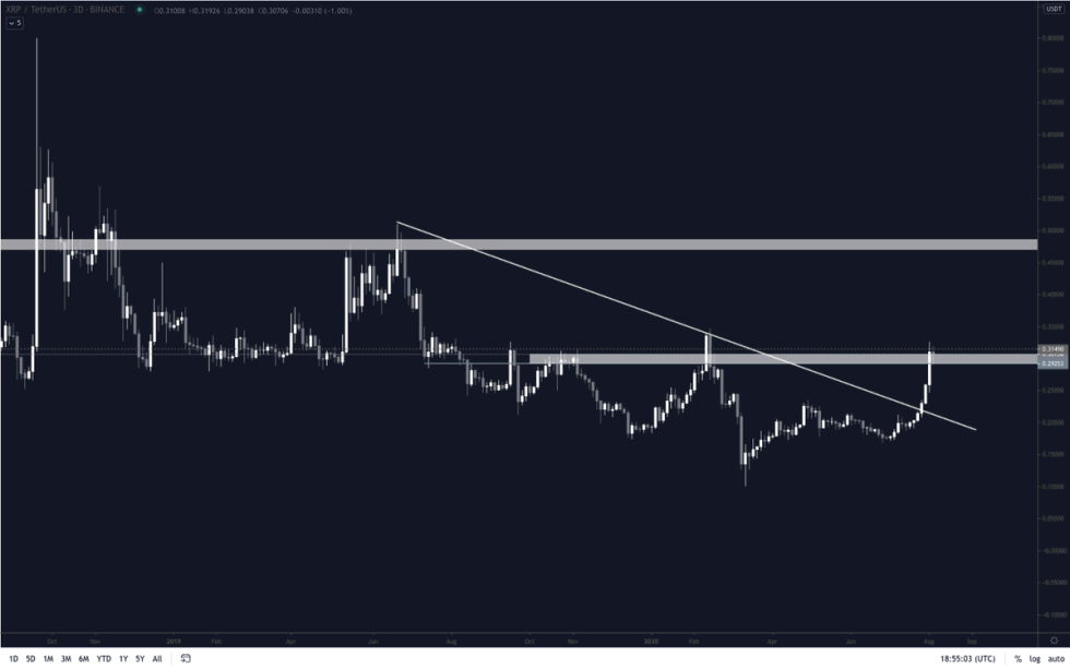 - Although this level was previously strong support, the buying pressure here is showing some signs of degrading as XRP dips below it