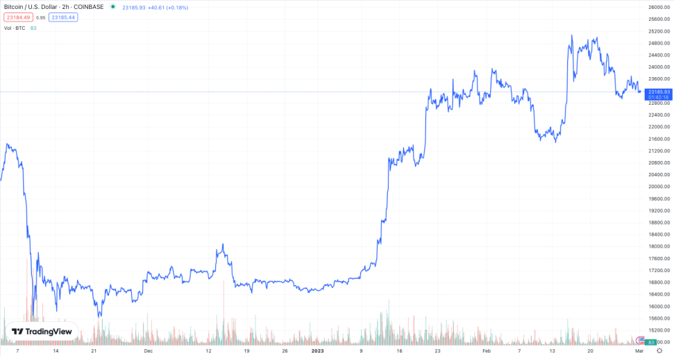 Yuga Labs is unleashing a project via ordinals - the 'NFTs of Bitcoin.' | Source: BTC-USD on TradingView.com
